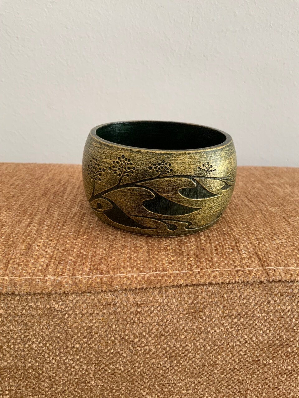 Polsera de fusta gravada i pintada a mà amb pintura acrílica.