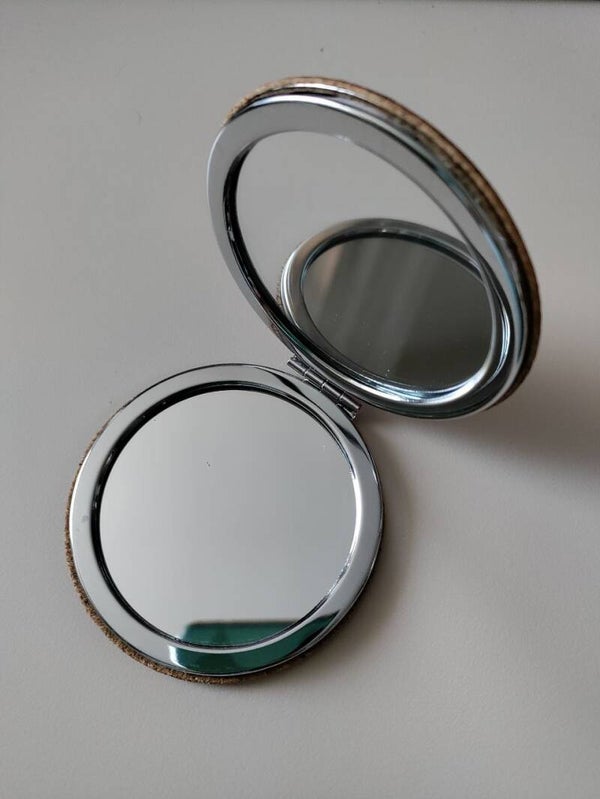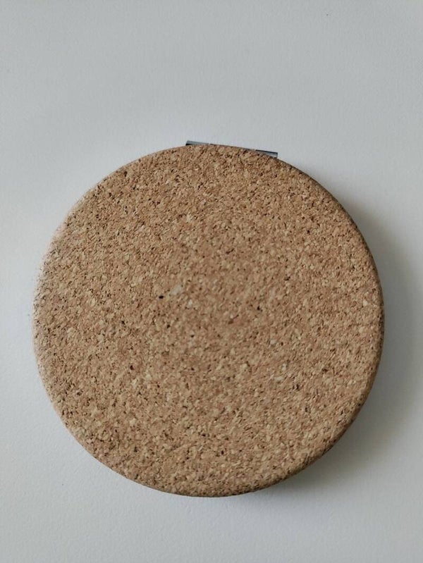 Mirall rodó de suro decorat amb l'arbre de la vida gravat amb làser i pintat amb pintures guix. Té dos miralls, un d'ells amb augment.Dimensions: 7x7x1 cm.
