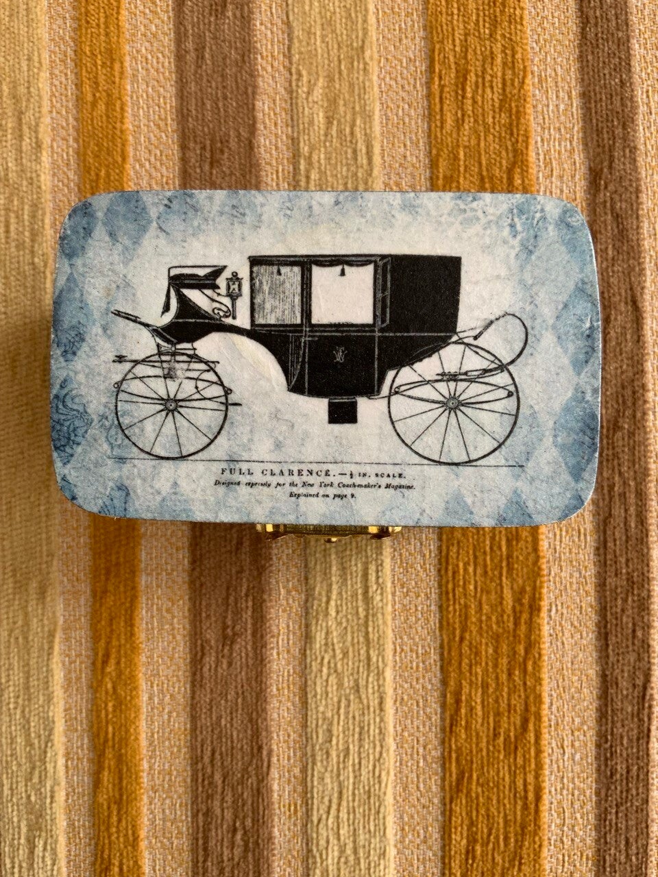 Capsa de fusta decorada amb pintures guix i paper d'arròs.Dimensions: 8,5x5,5x5 cm.