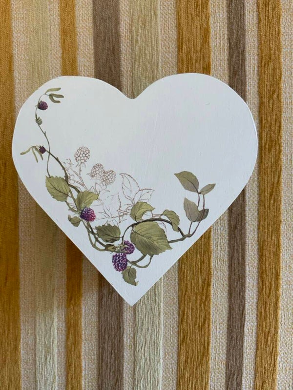 Capsa de fusta en forma de cor, decorada amb pintures guix i transferències.Dimensions: 12x12x7 cm.