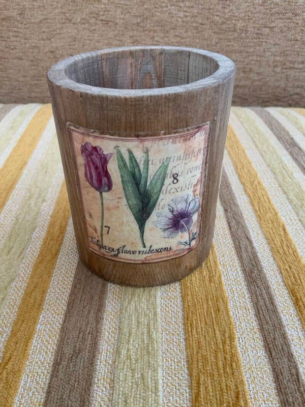 Pot de fusta tenyida, decorat amb paper d'arròs.Dimensions: 8x8x10 cm.