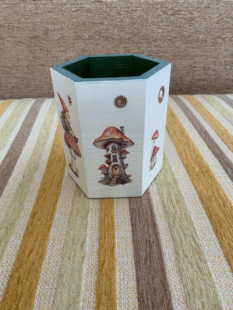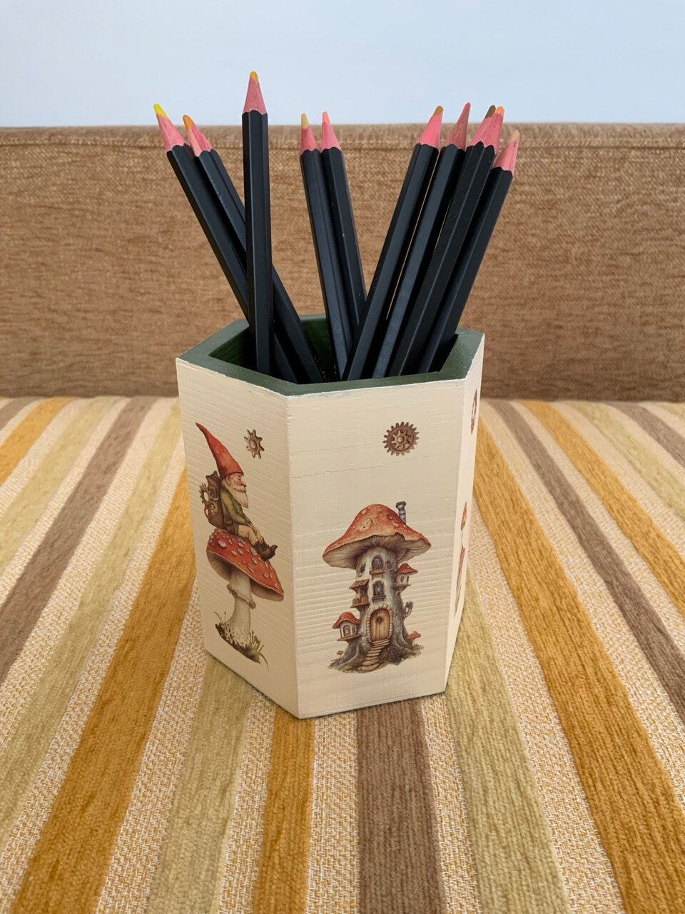 Pot portallapis de fusta decorat amb pintures guix i transferències.Dimensions: 9x8x9,7 cm