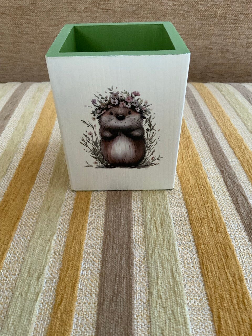 Pot portallapis de fusta decorat amb pintures guix i transferències.Dimensions: 8x8x10 cm