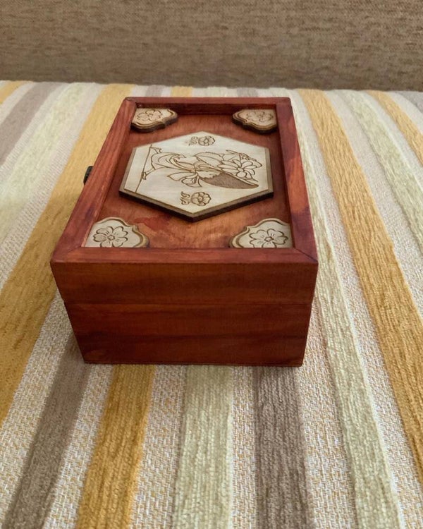 Capsa de fusta tenyida i gravada amb làser.Dimensions: 12x8x5 cm