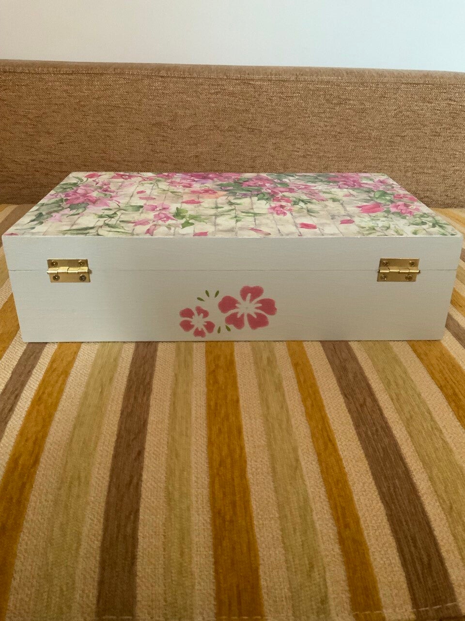 Capsa de fusta decorada amb pintura guix i paper d'arròs.Dimensions: 27,5x17x7 cm.