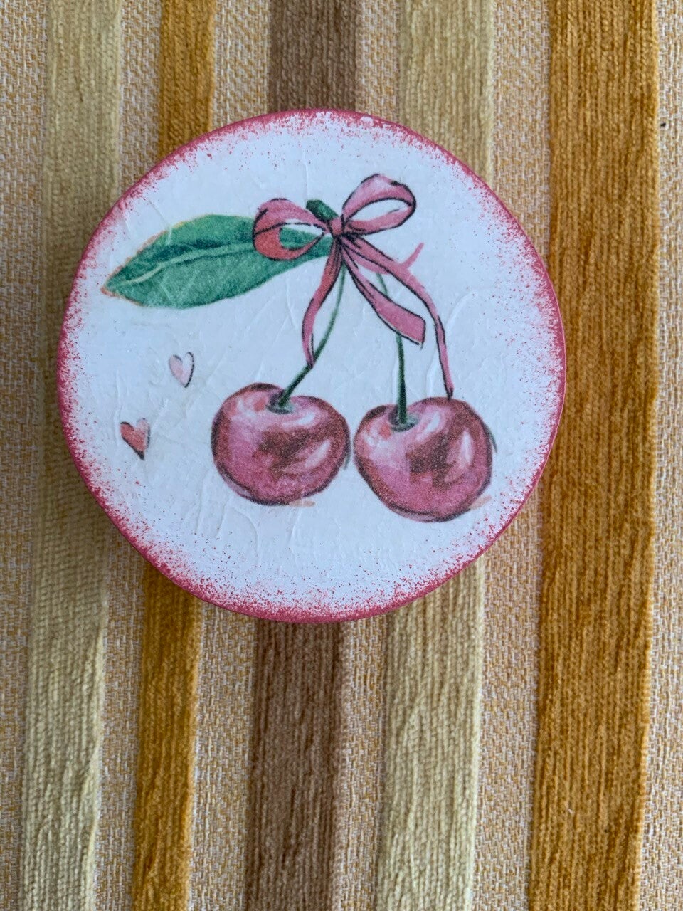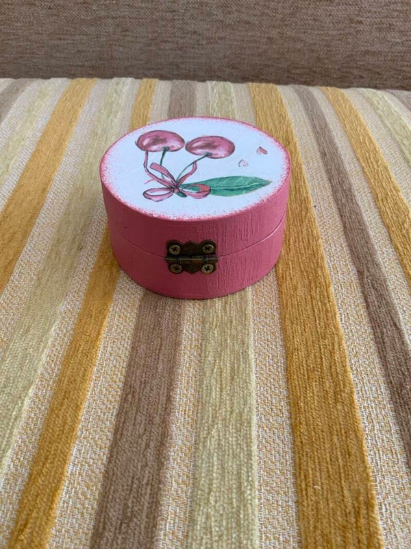 Capsa de fusta decorada amb pintures guix i paper d'arròs.Dimensions: 8x8x4 cm.