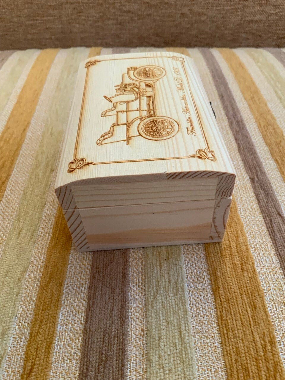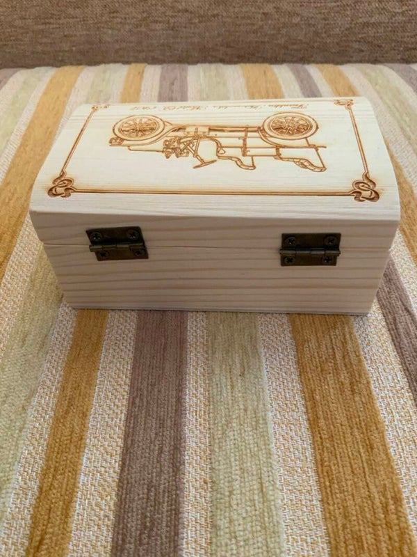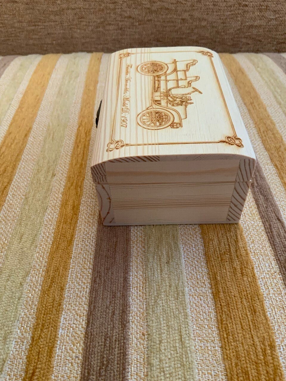 Capsa de fusta que porta gravat amb làser un automòbil Franklin model D 1907.Dimensions: 11,5x7,5x5 cm.